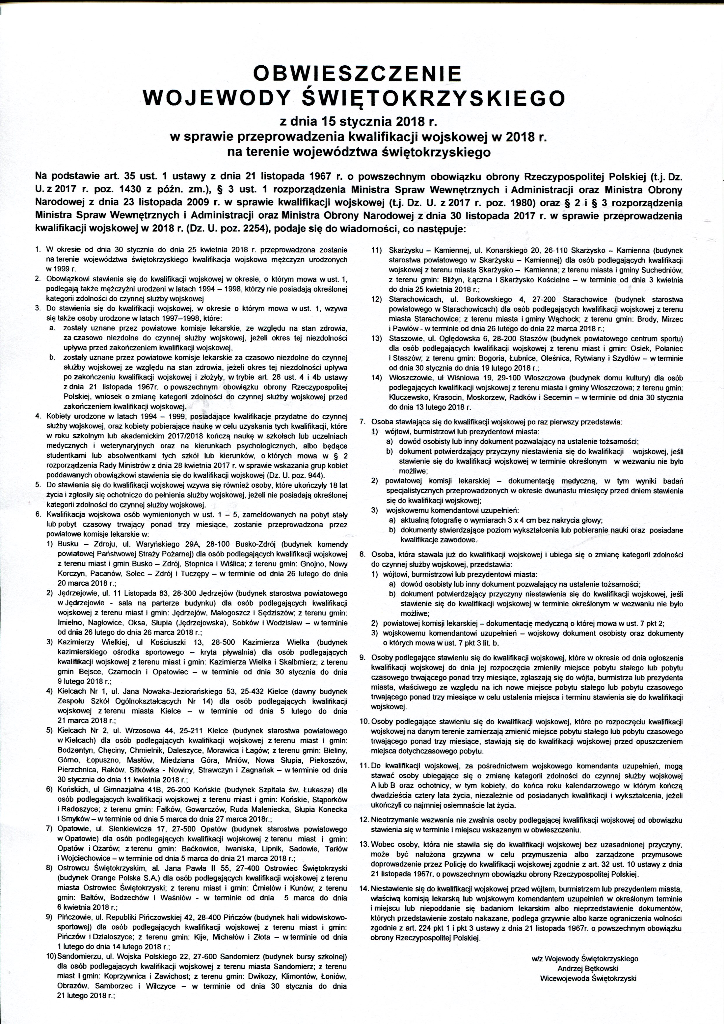 w sprawie przeprowadzenia kwalifikacji wojskowej w 2018 roku na terenie województwa świętokrzyskiego |